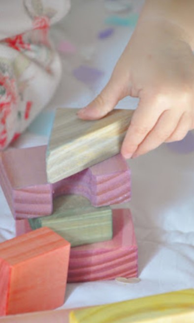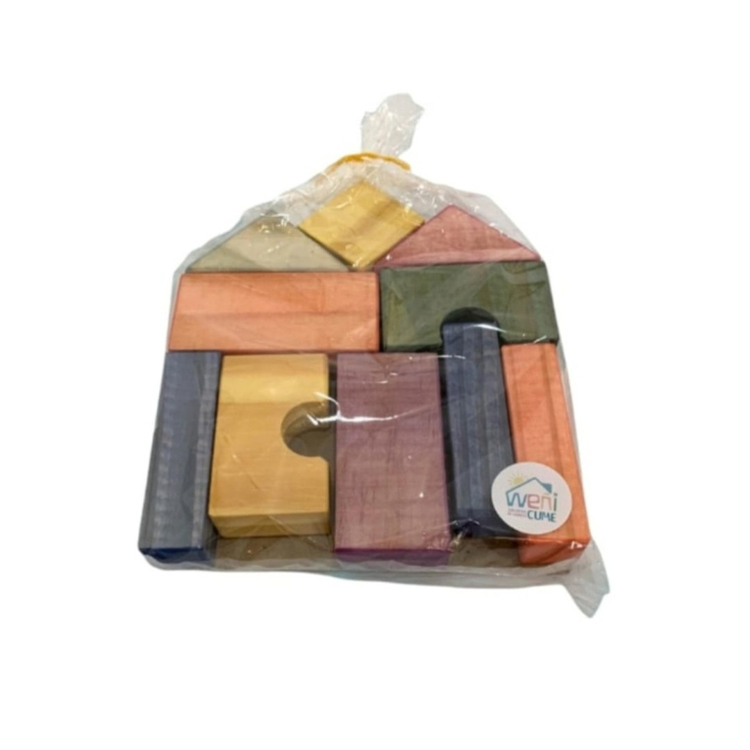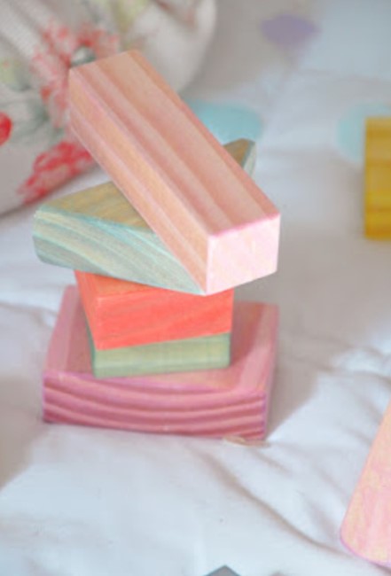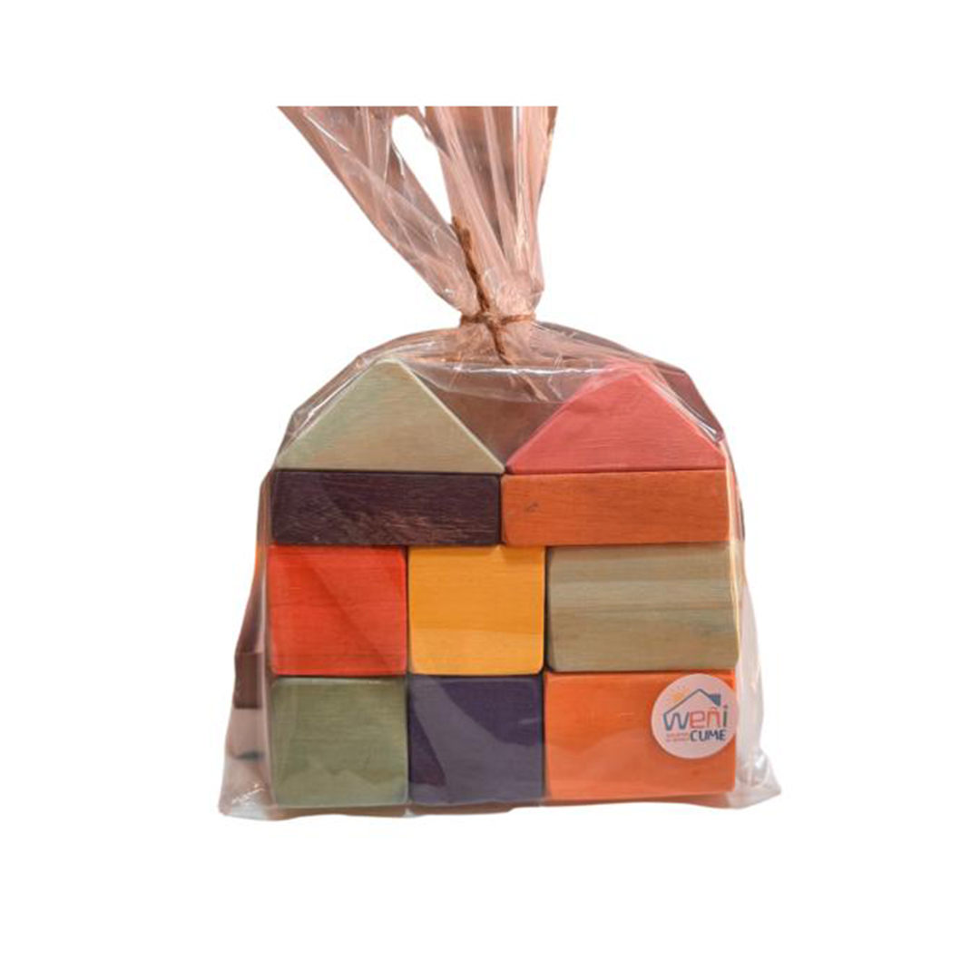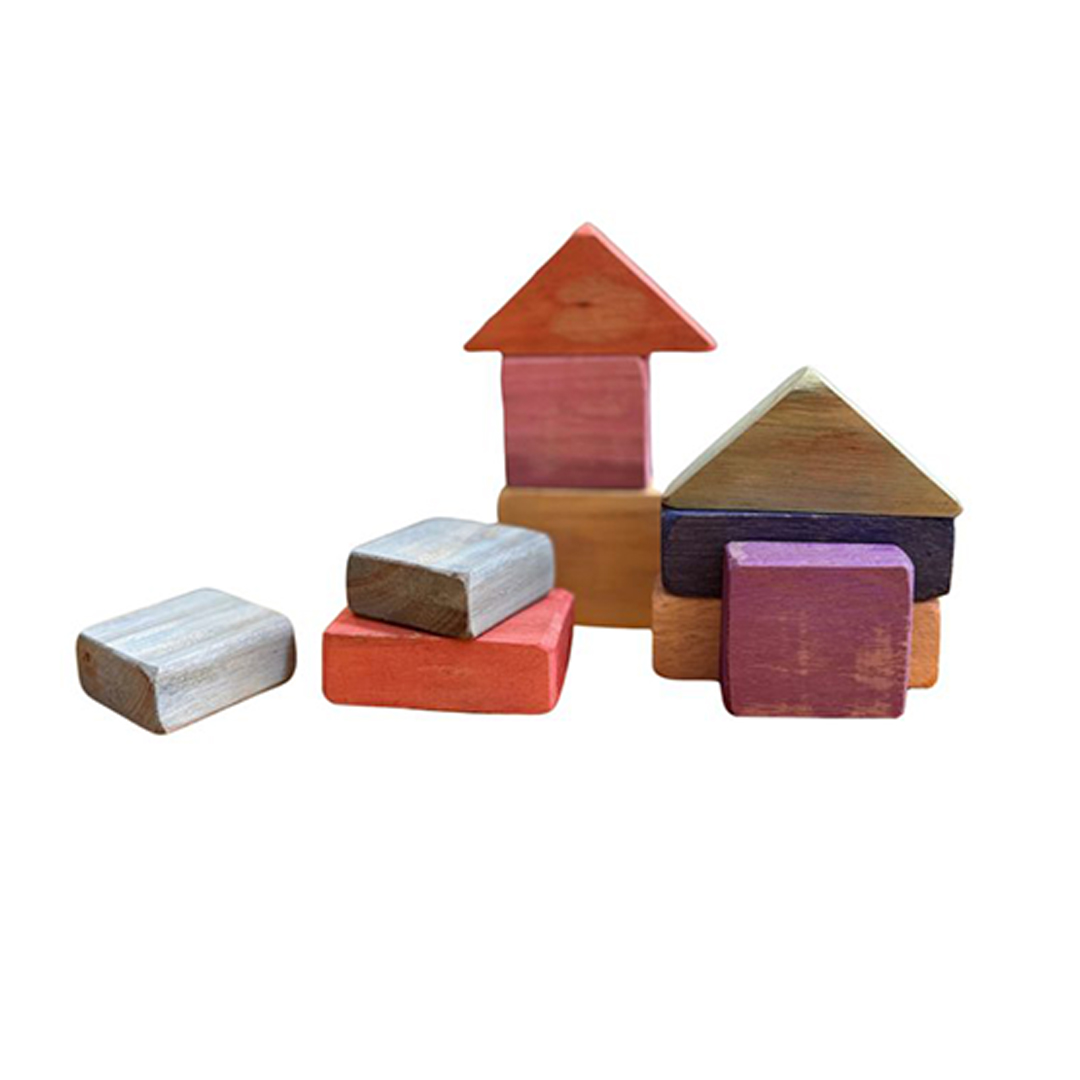Bloques de pino en colores y tamaños variados.